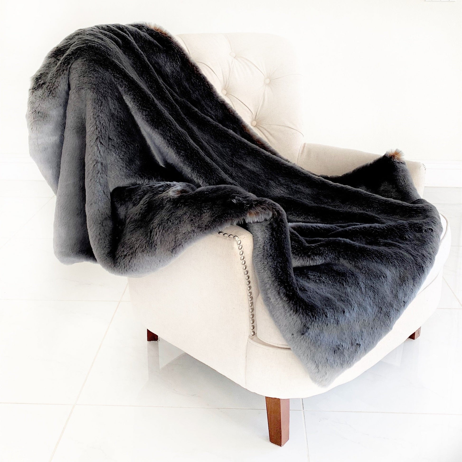 Experience the ultimate in cozy luxury with this two-tone Gray/Amber handmade faux fur throw. Made from 100% acrylic with long, plush fibers and a super soft backing, it offers unmatched softness and warmth. Reversible with a matching solid color on the back, this lush throw adds a sophisticated touch and inviting comfort to your home. Crafted in the USA, it delivers the elegant look of real fur without any harm to animals, making it a stylish and compassionate choice.